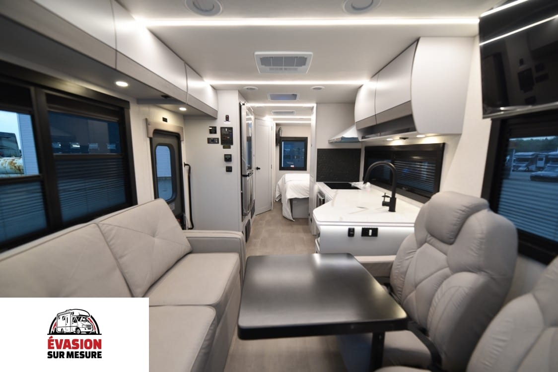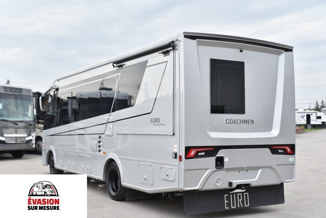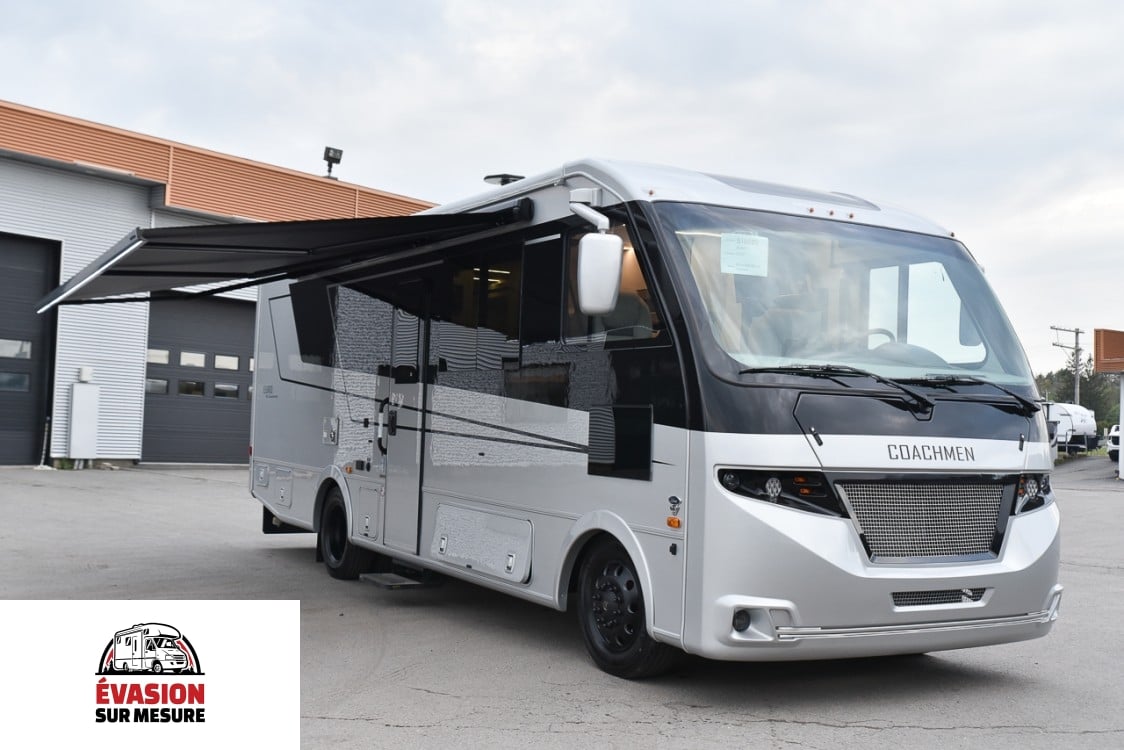 NOUVEAUTÉ UNIQUE EN SON GENRE. RIEN DE TEL SUR LE MARCHÉ. COACHMEN EURO 25EU 2025 Châssis Ford F53 7,3 L V8 Volant inclinable et télescopique Régulateur de vitesse Contrôle de traction Capteur de charge solaire avec gradation automatique Éclairage du tableau de bord Essuie-glaces intermittents Climatisation du tableau de bord Station de travail informatique avec USB, 12 V, 120 V Vérins de mise à niveau automatiques Moniteur de sauvegarde avec caméras de vue latérales Pneus radiaux Garde-boue arrière uniquement Entrée électrique Step-Single Toit couronné et laminé en fibre de verre Portes de coffre à rayon Capuchon avant en fibre de verre Serrure à pêne dormant-Porte d’entrée Porte d’entrée à rayon de 26 po Auvent de terrasse sans pattes Attelage de remorquage 8 000 avec prise 7 voies Rétroviseurs chauffants électriquement Pare-chocs arrière Auvent(s) coulissant(s) (le cas échéant) Réservoir de GPL de 20 gallons Rallonges de tige de valve Branchement extérieur au propane Cordon d’alimentation de 50 A Panneau solaire 300 W avec contrôleur Interrupteur de transfert automatique Convertisseur 55 A avec panneau de distribution Circuit GFI Prise extérieure Interrupteur de démarrage d’urgence Fournaise EI de 30 000 BTU Double climatisation Centre de commandement des autocars Éclairage intérieur à LED Générateur de gaz de 5,5 kW Guides de tiroir à roulement à billes à fermeture automatique Linoléum haut de gamme partout Fenêtres carrées avec stores jour/nuit Sièges pilotes inclinables/pivotants Canapé (convertible en lit) Table Lagon Plancher du cockpit facile à nettoyer Radio à écran tactile Radio AM/FM avec Bluetooth Apple CarPlay et Android Auto Link activés Alarme de fuite LP et détecteur de fumée Detecteur de monoxyde de carbone Extincteur d’incendie Antenne TV et radio King Jack Coach TV intelligente Pré-câblé pour antenne parabolique Station de recharge pour appareils électroniques Pare-soleil électrique pour pare-brise avant Hotte de cuisinière en acier inoxydable avec lumière Réfrigérateur à double porte en acier inoxydable Robinet de cuisine de grande hauteur Évier en acier inoxydable Comptoir de cuisine à surface solide Table de cuisson à induction Toilettes en porcelaine avec chasse d’eau au pied Contour de douche en ABS monobloc Porte de douche en verre Évent de bain électrique Chauffe-eau à la demande Pompe à eau à la demande Puits de lumière au-dessus de la douche Lavabo en acier inoxydable Rinçage du réservoir noir Télévision dans la chambre Prises de courant des deux côtés du lit