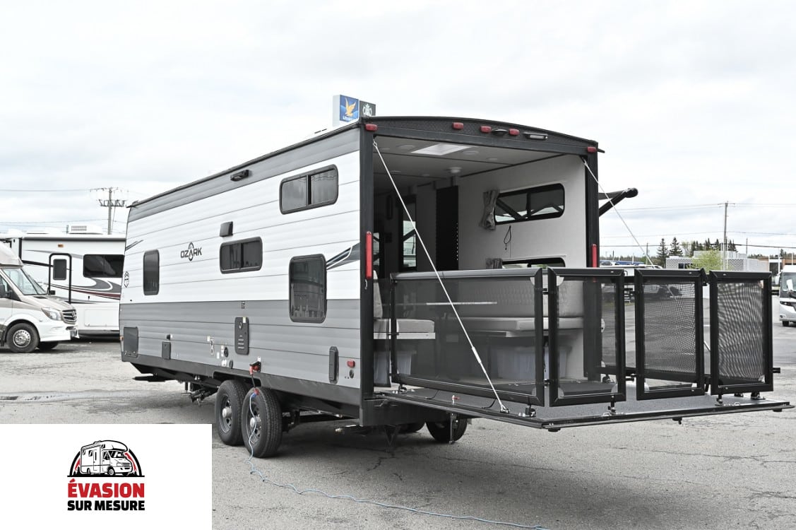 CARACTÉRISTIQUES CLEAR CHOICE (INCLUSES) Inclinaison du lit Versa Tilt (sur les modèles concernés) Éclairage intérieur LED à intensité variable « Blade Lighting » (salon) Système audio JBL – intérieur / extérieur Bande LED extérieure sous l’auvent Préparation pour caméra de recul Pré-câblage pour panneau solaire Auvent électrique avec pieds réglables Prises USB pour recharge Ensemble électroménager amélioré Porte d’entrée à charnière à friction Évier de cuisine à cuve profonde avec robinet surélevé Matelas hypoallergénique amélioré Plans de travail sans joints, pressés Terrasse avec rambarde sur porte de rampe (pour les Toy Haulers uniquement) AVANTAGES DE CONSTRUCTION (INCLUS) Plancher en contreplaqué à rainure et languette de 5/8″ Membrane de toit TPO 35 mil Châssis en I peint par poudrage avec cambre pour un meilleur soutien structurel Pneus remplis d’azote Murs de 2″, structure tous les 16″ (ou moins) Isolation en fibre de verre sur l’ensemble du véhicule Profil avant aérodynamique pour faciliter le remorquage Profil avant en aluminium lisse .040 pour une rigidité accrue Plaque de protection diamantée à l’avant contre les projections Tuyauterie d’eau codée par couleur Réservoirs d’eaux usées sans joint Bouteille(s) de propane de 20 lb pour un camping prolongé PACK PARTENAIRE PREMIER (INCLUS) Porte d’entrée avec fenêtre Vitres extérieures teintées pour plus d’intimité Chauffe-eau instantané sans réservoir de 60 000 BTU Réfrigérateur 12V extra large en verre noir Système d’accès sous le plancher « Accessibelly » pour protection contre le climat et les débris